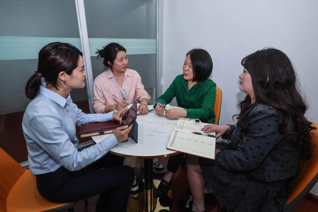 4月17日,在浙江星程吉月智能科技有限公司,富阳经济技术开发区助企服务专员(左二)、富阳农商银行工作人员(左一)上门解决企业融资需求。新华社记者 徐昱 摄